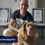 Five years later, they gathered again — ten grown dogs beside ten firefighters in front of the rebuilt home.