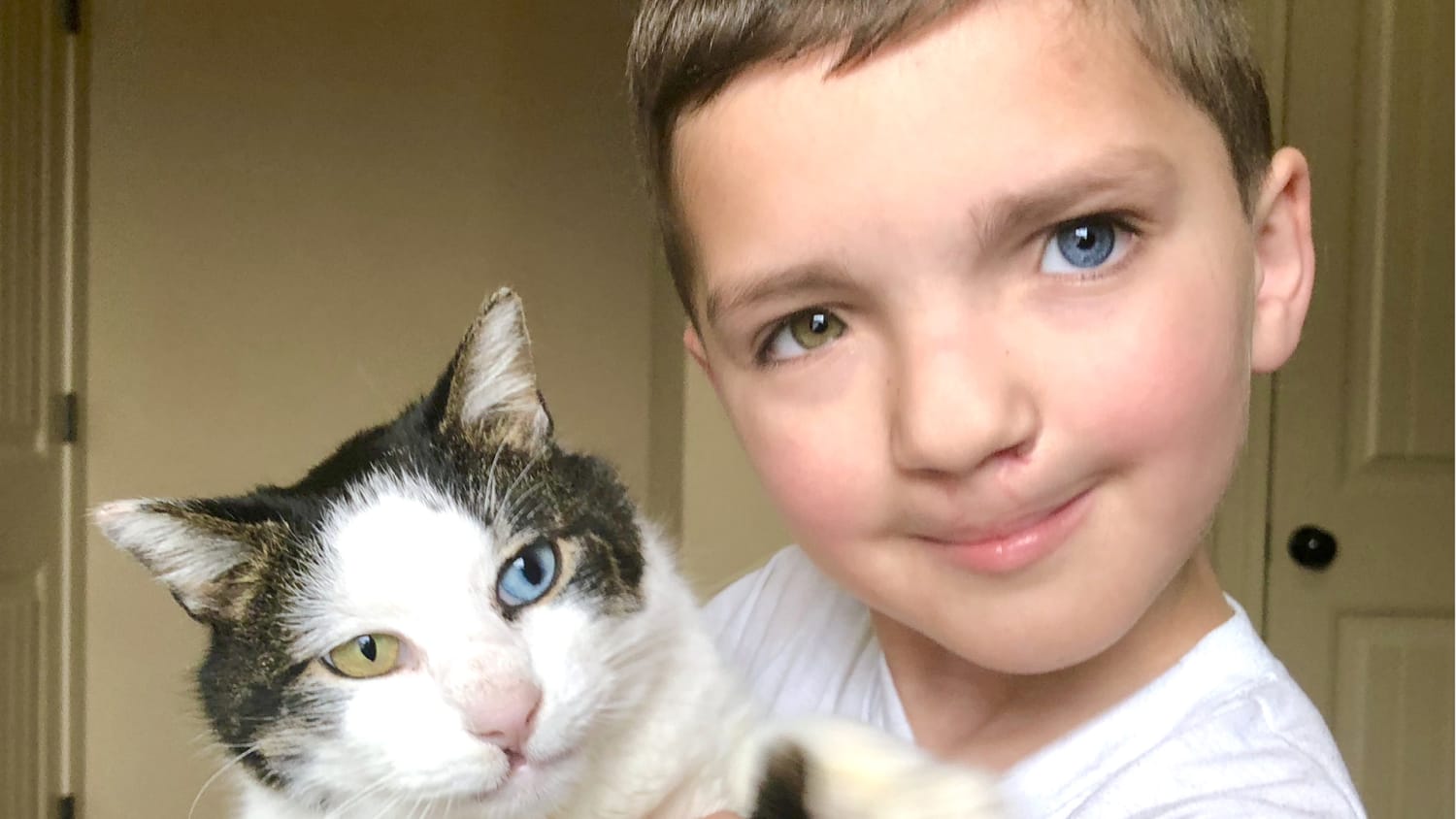 Then one day, everything changed. His family discovered Moon, a rescue cat from Minnesota — who, unbelievably, had the exact same cleft lip and mismatched eyes.   Without hesitation, they drove across states to bring Moon home.