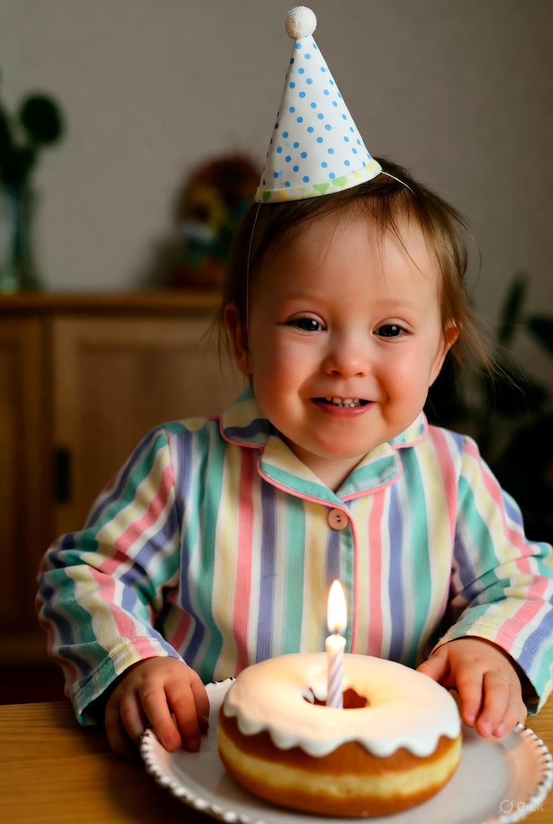 Fast forward to today — that same little fighter has become a burst of joy and laughter, celebrating her birthday with a pretzel in one hand and a party hat on her head. 🎂🎉😄