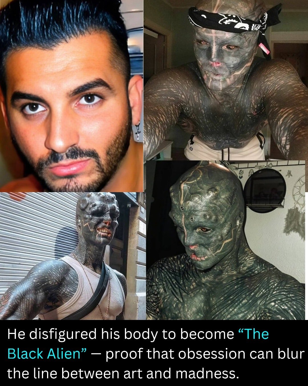 Over the years, he has transformed that dream into reality through extreme body modification β enduring countless surgeries, tattoos, implants, and piercings. He even chose to remove parts of his nose, ears, and fingers, reshaping his body into what he calls βThe Black Alien.β π€