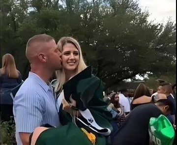 The same stage where her father once stood — only this time, she wore the cap and gown, and he stood proudly in the crowd, holding tears instead of a diploma.
